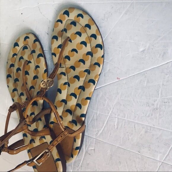 Tory Burch Emmy Thong T Strap Leather Sandals Ballet Flats Patent Graphic Print