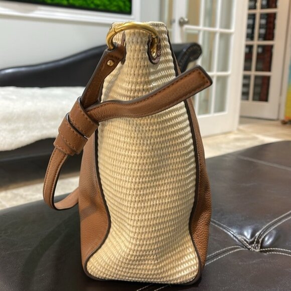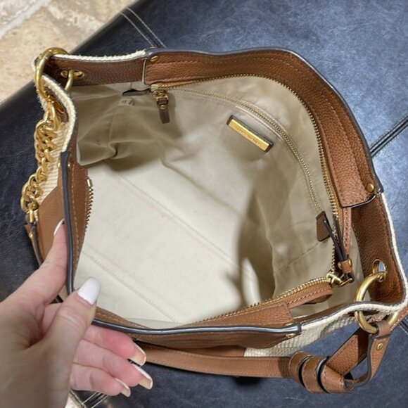 Pebbled leather and woven straw contrast on this roomy hobo bag, providing the perfect balance of city refinement and rustic charm. Stacked-T medallion hardware and a chain-detailed shoulder strap keep it in polished territory.