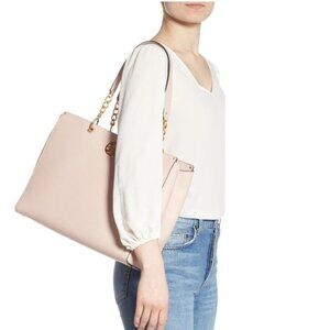 Divided interior with center-zip pocket; interior zip and wall pockets