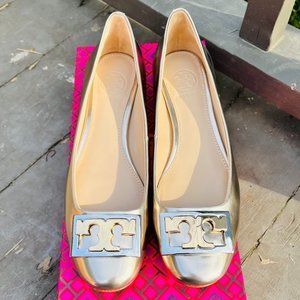 Tory Burch Gigi Dress Pumps in Metallic Gold w/ T Logo & Blocked Heel, Brand-New