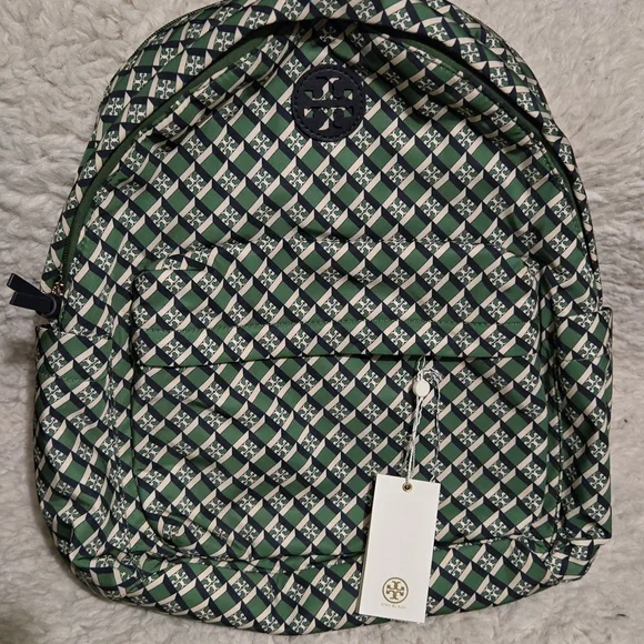 Stylish and functional, this Tory Burch backpack features a unique green pattern. Perfect for everyday use, it combines fashion with practicality.