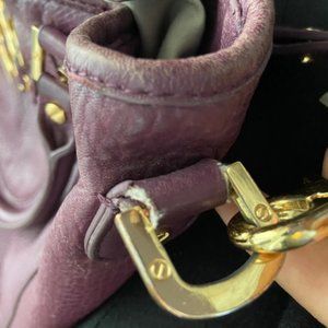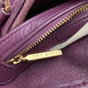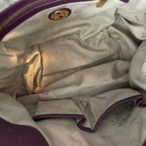Well loved Tory Burch bag - was used for about 2 years consistently. Shows signs of wear on the leather and some faint staining in the lining. Most noticeable leather wear seems to be along the top rim edge of the bag.
