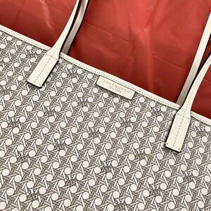 Basketweave pattern zip tote in New Ivory with removable pouch. One internal zip compartment.