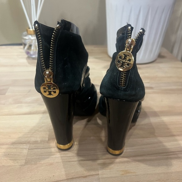 Excellent condition, very comfortable pair of Tory Burch Jeslann Patent and Suede Peep Toe Ankle Boot in size 7