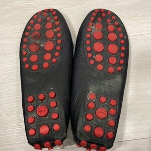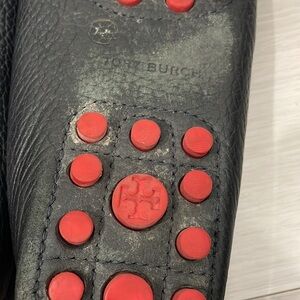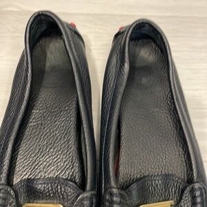 Tory Burch Kendrick driving loafers in navy blue leather with gold toned emblem, cushioned insoles, red rubber outsole grips. Made in Brazil. Size 7.5. Good used condition with some signs of wear to insoles, some scuffs to the leather near the toes (photos), wear to outsole leather and grips, some creasing in the leather. Please see photos, Reasonable offers welcome!