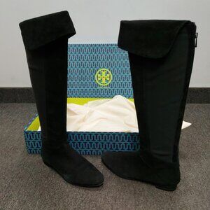 For sale is a pair of Tory Burch Kevin Over The Knee Boots in Willow Suede, color Black 009, size US 8.5. Crafted from soft and luxurious willow suede, these boots feature a velvety black finish that exudes sophistication. The over-the-knee silhouette extends just above the knee, offering a sleek and elongating look, while the 35mm (1.4-inch) low block heel provides comfortable all-day wear. A side zipper with a gold-tone Tory Burch logo pull ensures easy wear and adds a subtle designer touch. These boots are in good used condition, with minor signs of wear including light creasing on the suede, slight scuffing on the soles and heels, and minor surface marks (visible in photos). There are no major tears, stains, or structural damage. They come with the original Tory Burch box (style number 32148486), tissue paper, and dust bags for storage. Perfect for adding a touch of luxury to your wardrobe, these boots are ideal for pairing with jeans, dresses, or skirts for any occasion.