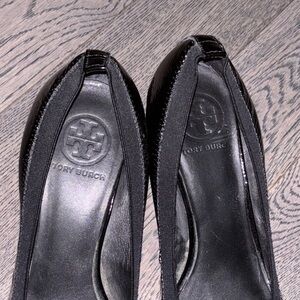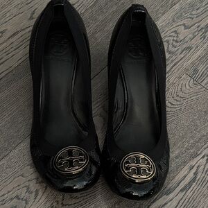 Tory Burch Logo Black Patent Caroline Wedge Pumps