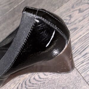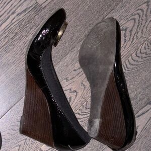 ⭐️🖤Omg comfy Chic Tory Burch Wedge in glossy black. Features iconic gold logo detail. Perfect for versatile styling. Preloved good wear / one piece scratch flaw condition approx measurements photographed