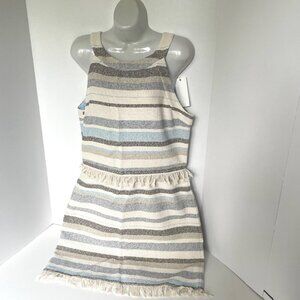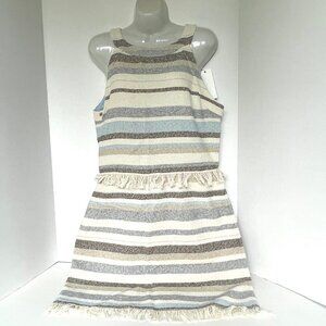 Tory Burch Mini Fringed Boho Dress 10 Ivory Sleeveless Cotton Sheath Stripe