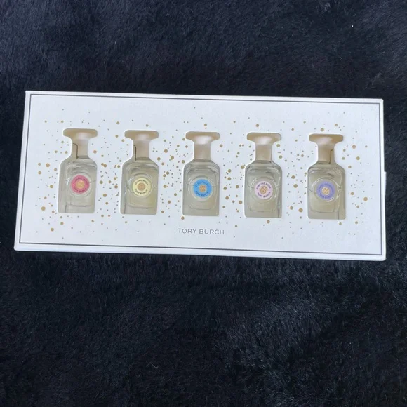 Set of five mini perfumes by Tory Burch. Each bottle features a unique color accent. Perfect for gifting or personal use.
