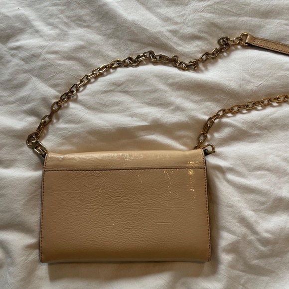 It is a beautiful crossbody bag with a gold detachable chain. Enough space for a phone, cards, and a few small items/makeup.