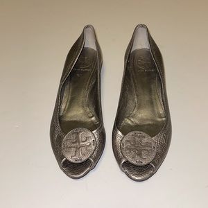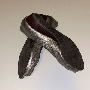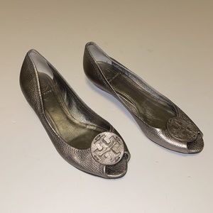 EUC Tory Burch pewter metallic leather peep-toed flats in women’s size eight and a half ( 8 1/2 ).