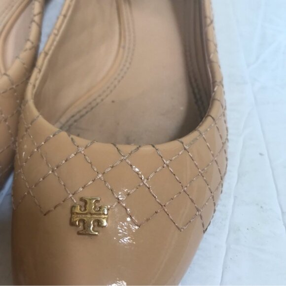 Tory Burch Quilted Patent Leather Ballet Flats Logo Neutral Shoes Round Toe Tan