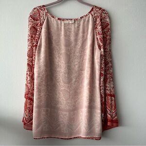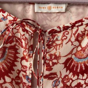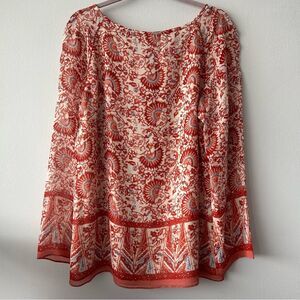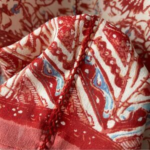 Elegant floral blouse with red and white pattern. Features a tassel tie at the neckline. Perfect for casual or dressy occasions.