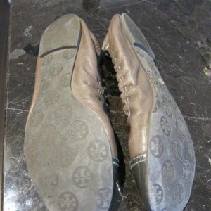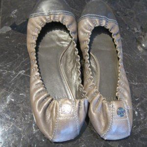 Grey and Silver Tory Burch Reva Ballerina Flats. Small Tory Burch medallion on the ankle. Light grey leather with darker grey leather at toe cap. Lots of life left in them. Great neutral!