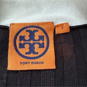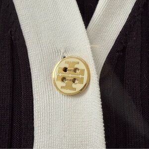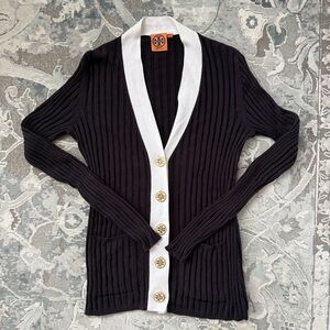 -Tory Burch cardigan in deep navy with white trim detailing & made with soft stretchy 100% cotton
