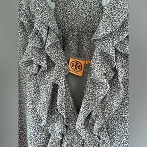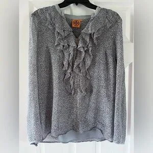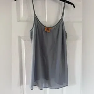 This Tory Burch blouse is sheer but comes with a matching camisole so you can decide on your own way to style it. Blouse is 100% silk, the camisole is polyester.