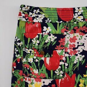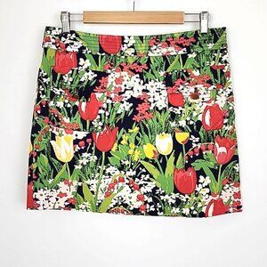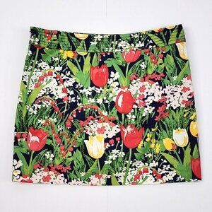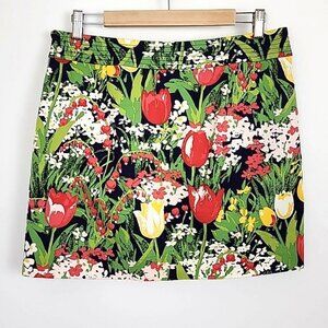 Excellent pre-owned condition, Tory Burch lined mini skirt with multi color all over tulip print in red, yellow and green with two front patch pockets lined and side zip, size 8.