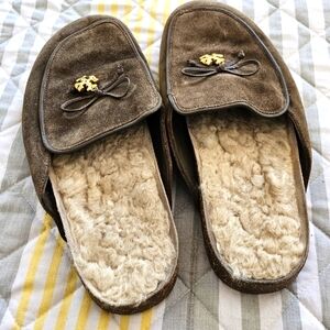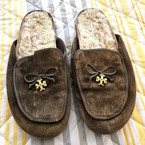 Tory Burch Suede Leather Mules Shearling Toasted Caramel Buttermilk/Tan 9.5