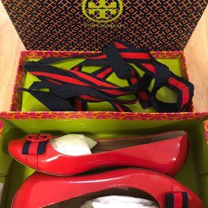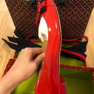Tory Burch Women's red patent leather bow ballet flats shoes with lacing size7 Purchased from Toronto Premium Outlets, bundled new, worn 2-3 times, in excellent condition, like brand new, flat shoes, very comfortable, shoebox, wrap, and receipt all present.