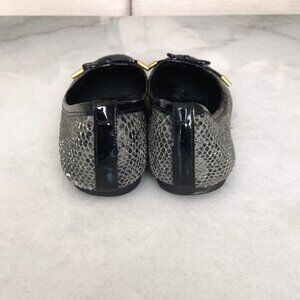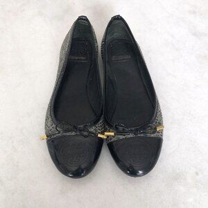 Authentic Tory Burch black cap toe patent leather & grey snake ballet flats with bows, & gold hardware