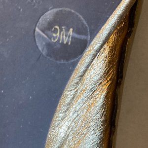 Metallic gold leather shoes with gold Tory Burch logo in heart at the toe