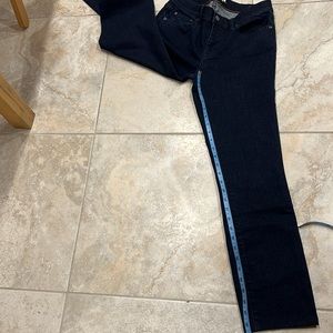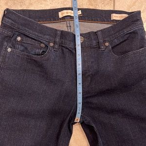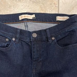 Tory Burch supper skinny jeans pants, gently used in excellent condition, dark blue, size 29. These pair of pants is 98% cotton and 2% spandex. There is some stretching.