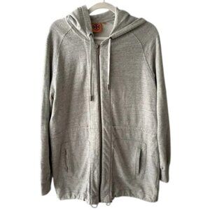 A Tory Burch full-zip hoodie in grey. Features a full-zip front, an attached hood with drawstrings, and long sleeves. The jacket has prominent, rectangular patch pockets on the lower front. There is an adjustable drawstring at the hem, which allows for cinching the waist or bottom of the jacket for a customized fit or silhouette.