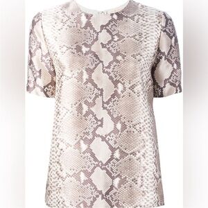 Brown silk-wool blend snakeskim print blouse from Tory Burch. Lightweight and breathable with a concealed back zip and relaxed, unlined fit.