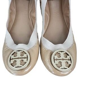 In very good condition. Beautiful tan patent leather Tory Burch Caroline flats. Broad elastic top like ensures a secure and comfortable fit. A hold enamel inlaid medallion tops the rounded toe. These are showing some wear on the bottom, but otherwise these are in excellent condition with no marks on the patent leather.