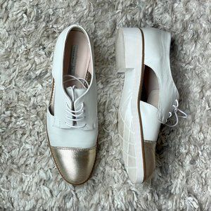 Tosca Blu white and gold lace-up leather Oxfords. Leather, Made in the EU. Side cut-out. In excellent condition, worn only a few times.With original box and bag. EU 40.