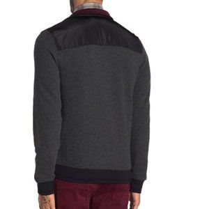 A contrasting paneled jacket with a front full zip closure and front welt pockets offer a laid-back, yet cozily warm attire.