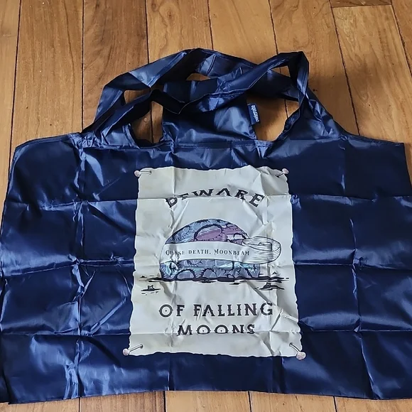 Stylish navy blue tote bag featuring a unique moonbeam design. Perfect for everyday use. This bag is perfect to bring shopping as its compacts to fit perfectly in your purse.