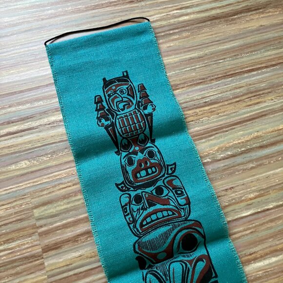 Vintage woven fabric wall banner has a print design of an Indigenous totem pole and says "Banff Canada" along the bottom edge. Top & bottom edges have wood dowels, top edge has black cord for hanging. Approx. 8 1/2" wide x 36" long. Pre-owned vintage condition: Blue fabric has some fading/discoloration from display & age.