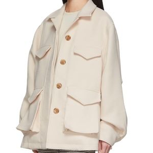 Long sleeve worsted jacket in off-white. Notched lapel collar. Button closure at front. Flap pockets at chest and waist.