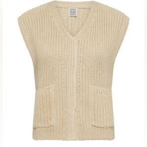 Refined and relaxed, this Totême sleeveless sweater offers a fresh take on a layering essential. Crafted from a breathable linen-cotton blend, it features a flattering V-neckline, clean sleeveless cut, and two front patch pockets for understated functionality. The soft ecru hue adds a neutral tone that fits seamlessly into any minimalist wardrobe.