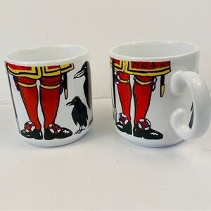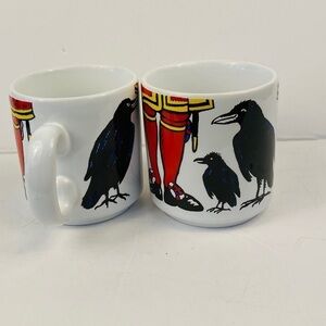 Set of 2 adorable 8 ounce mugs decorated with ravens and the legs of the Beefeaters (Yeoman warders) that guard the Tower of London. The bottoms say for the tower of London by picturemaps made in England