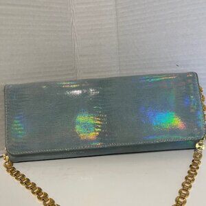Size 12” X 5” (picture 4). Color duck egg blue. Material: outer metallic embossed leather. Inner lining polyester fabric. 25” chain handle. 58” leather shoulder strap. One inner zip pocket. Snap button closure. Condition: Good. Outer is flawless, however some cracking on the inner flap from storage (pictures 6 & 7).