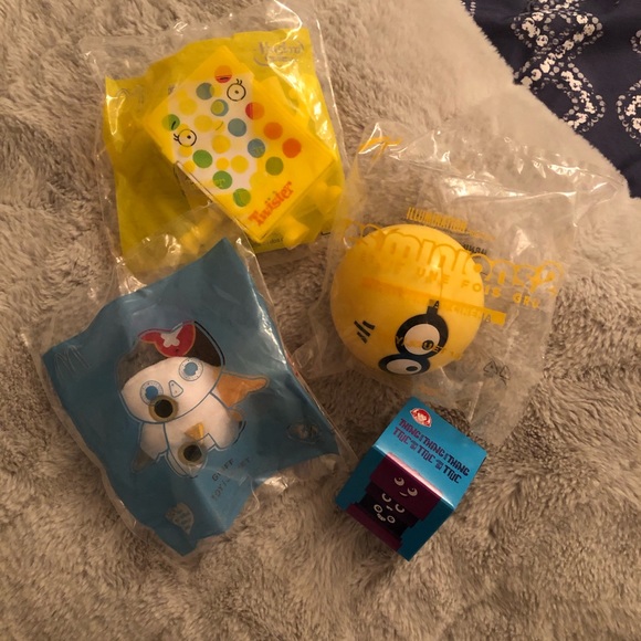 Bundle of 4 toys: 3 are from McDonald’s happy meals (1 Griff beanie boo, 1 Hasbro Twister, 1 Minion) and 1 is a “Thing in a thing in a thing” from Wendy’s