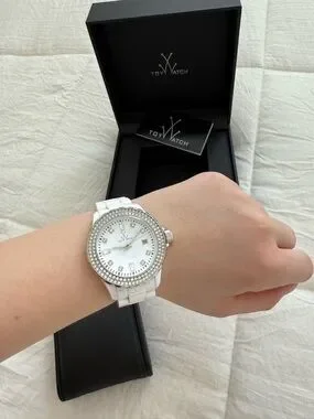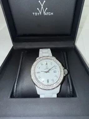 ToyWatch Plasteramic watch, featuring a white dial, Swarovski crystal markers, and a durable plasteramic bracelet.