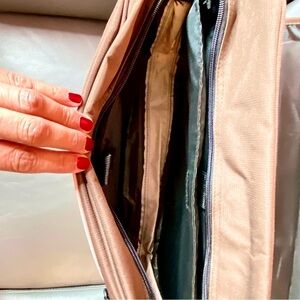 Stylish Tracker messenger bag in brown and pink. Features a spacious interior and adjustable strap. Has zipper in the bottom to allow bag extension for more space. Can be used for work or school. Lots of space inside and lots of pockets outside for laptop, books, notebooks, binders, chargers, headsets…