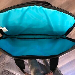 Turquoise brown and white case measures 16" wide x 11" in length . The case has carry handles, and a zipper closure. There is a pocket on the back for