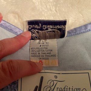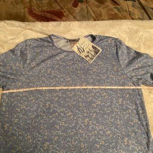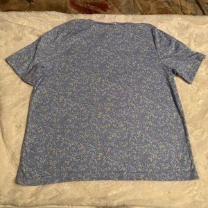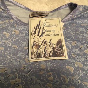 Tradition Country Collection T-shirt, brand new with tags. Vintage T-shirt is Size Large (14-16), floral print with blue-grey and beige colours. 65% polyester, 35% cotton, machine washable. All measurements are approximate and may slightly vary. Measurements are taken by hand with item laying flat and unstretched. All items are from my smoke free home.