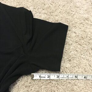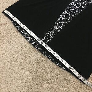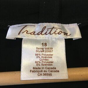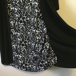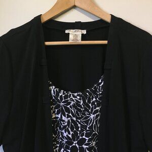 Very good preowned vintage condition, black short sleeve cardigan with a sewn in floral white and black batik style print shirt/fabric by Tradition. A cute stretchy, bouncy, flouncy 2 in 1 piece that is perfect for warmer weather and avoiding excessive layers. Loops built into collar. Perhaps there for aesthetic reasons or for adding a scarf.