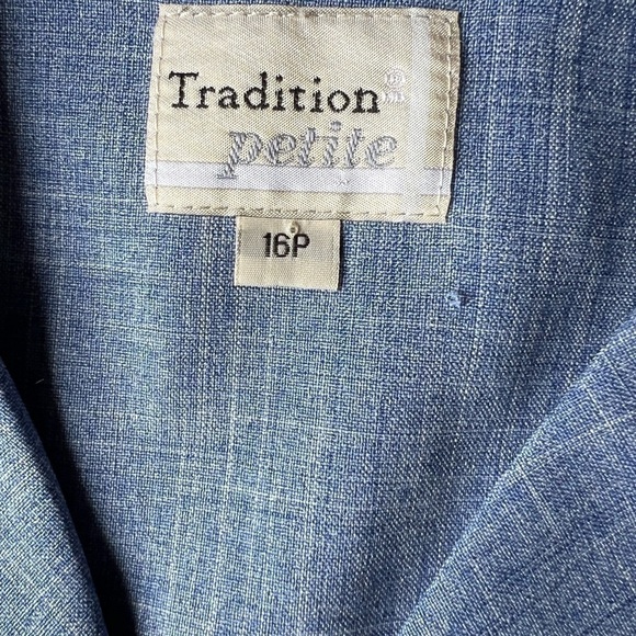 Tradition Petite Formal Casual Blue solid Floral Embroidered Blazer Suit. Size16 Great for work . In Excellent Condition Beautiful material with floral embroidery that is structured and holds its shape well. Offers welcome or bundle and save. Measures Approximately: Length= 22" Armpit to Armpit= 22" Please check the pictures