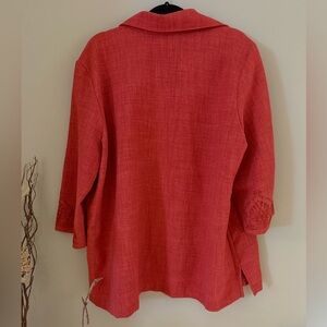 Vintage red jacket with elegant embroidered detail, 3/4 sleeves and unique button spacing. Perfect for versatile styling. A nice wrinkle-resistant addition to one’s wardrobe.
