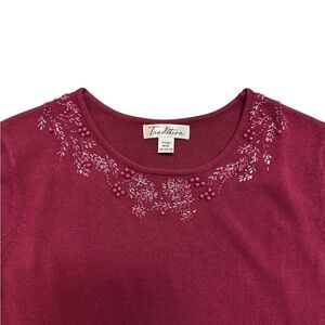 Tradition petite long sleeve sweater with beading along the front neckline.