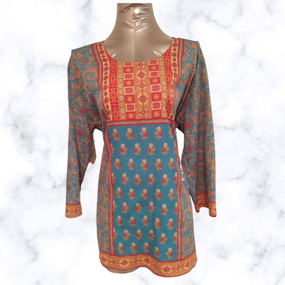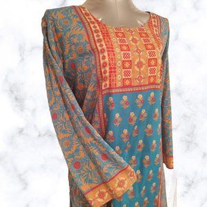 Perfect to wear as a dress or long shirt! Beautiful teal, orange and pink creates a fun and dynamic floral design.