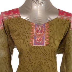 Traditional tunic made in India with a beautiful green, pink and purple design.