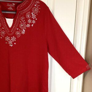 Traditions Country Collection Women's Red 3/4 Sleeve Top T-Shirt V-Neck Embellishments Christmas Festive